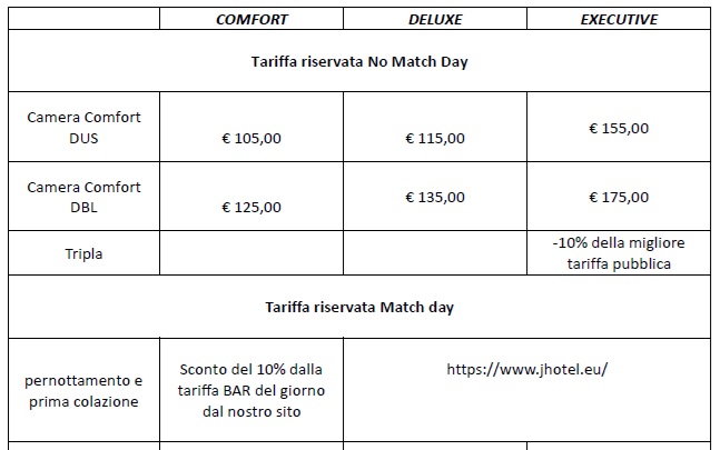 • Le tariffe non possono essere applicate durante determinati periodi fieristici, festivi, nonché in occasione delle partite casalinghe della Juventus. In tal caso verrà riconosciuta la miglior tariffa disponibile al momento della prenotazione (BEST AVAILABLE RATE)
